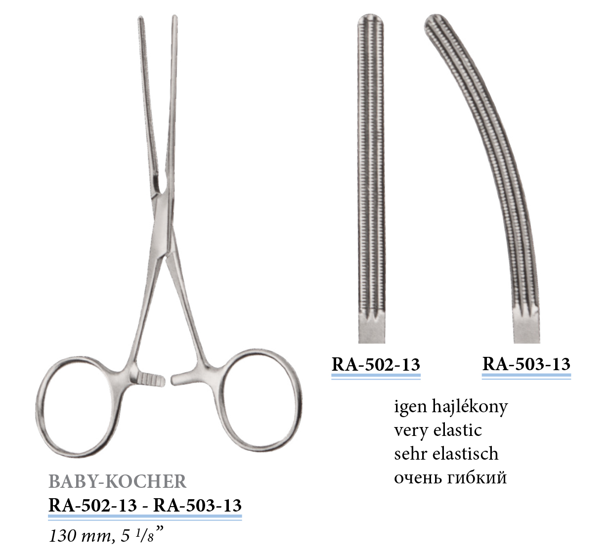 RA-502-13 Baby-Kocher bélfogó, egyenes, igen hajlékony, 130 mm
