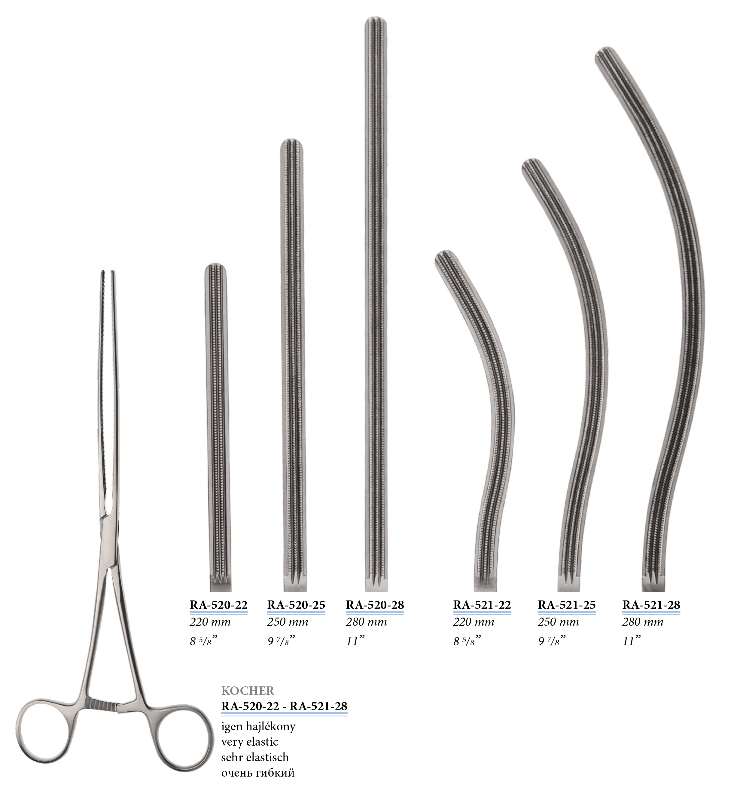 RA-520-28 Kocher atraumatikus bél- és gyomorfogó, egyenes, igen hajlékony, 280 mm