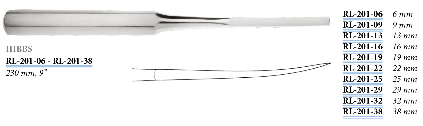 RL-201-19 Hibbs csontvéső, hajlított, 19 mm, 230 mm