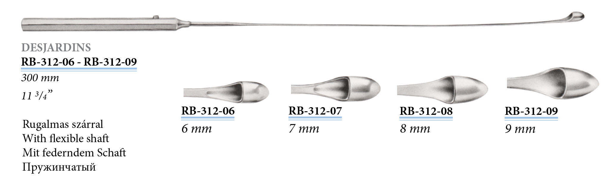 RB-312-08 Desjardins epekő kanál, rugalmas szárral, d=8 mm, 300 mm