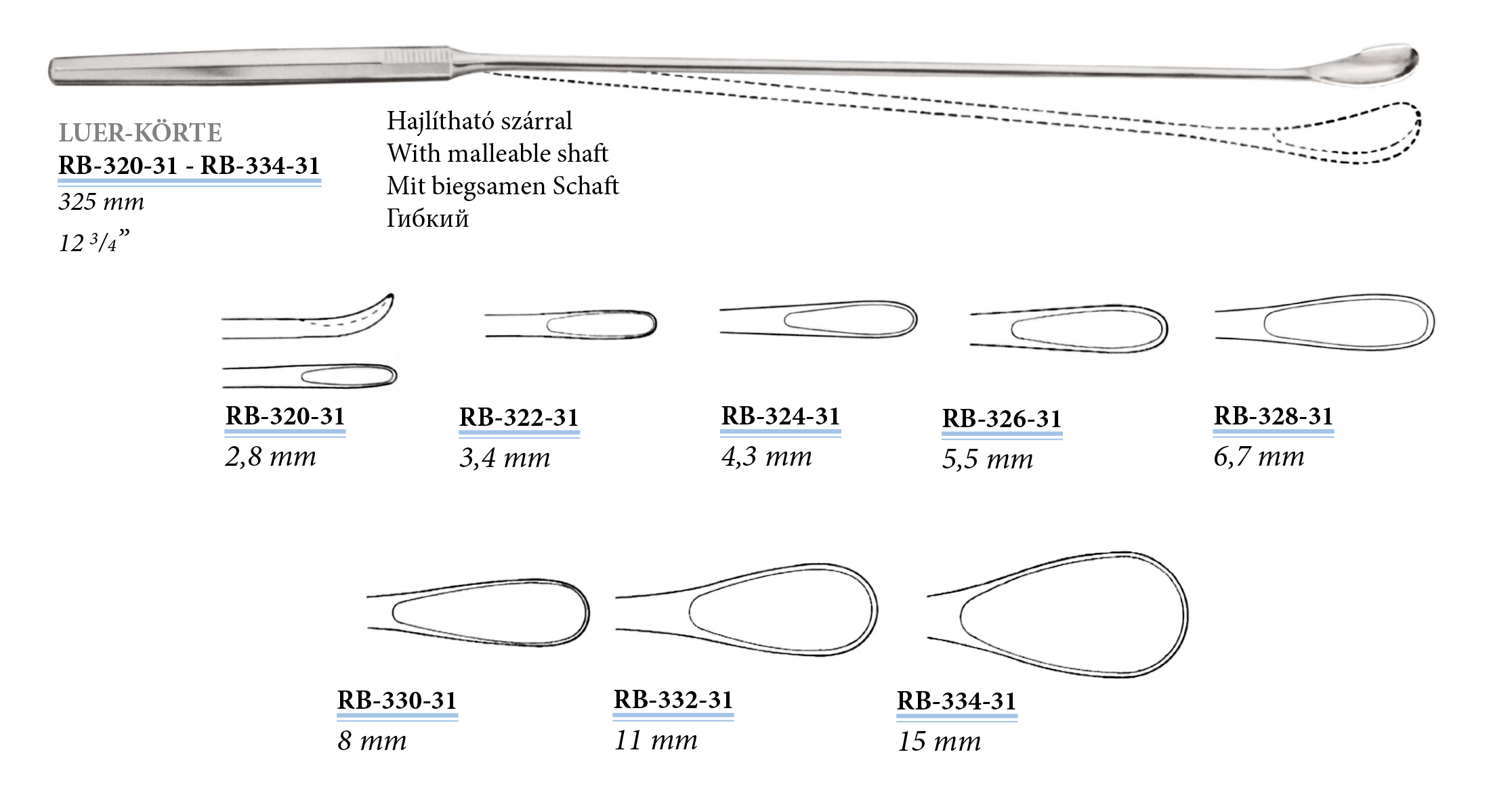 RB-330-31 Luer-Körte epekő kanál, hajlítható szárral, d=8 mm, 325 mm