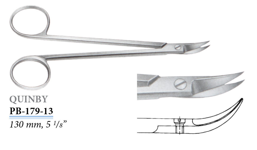PB-179-13 Quinby foghús olló, hajlított, hegyes-hegyes, 125 mm