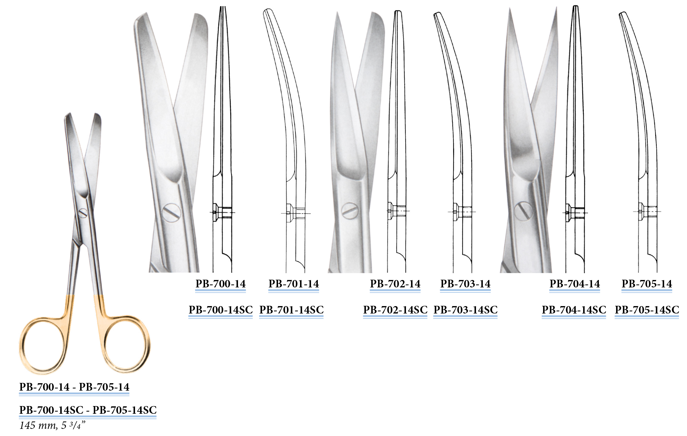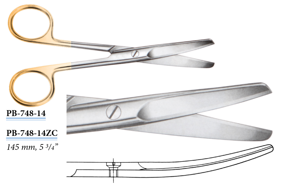 PB-703-14SC Sebészeti olló, hajlított, tompa-hegyes, 145 mm, keményfémbetétes, Super Cut