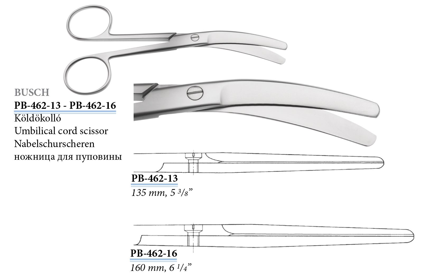 PB-462-13 Busch köldökolló, hajlított,135 mm