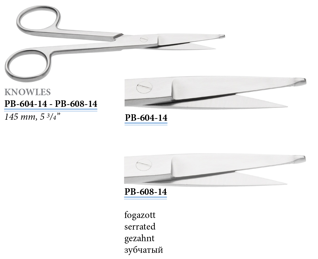 PB-608-14 Knowles kötszerolló, egyenes, fogazott, 140 mm