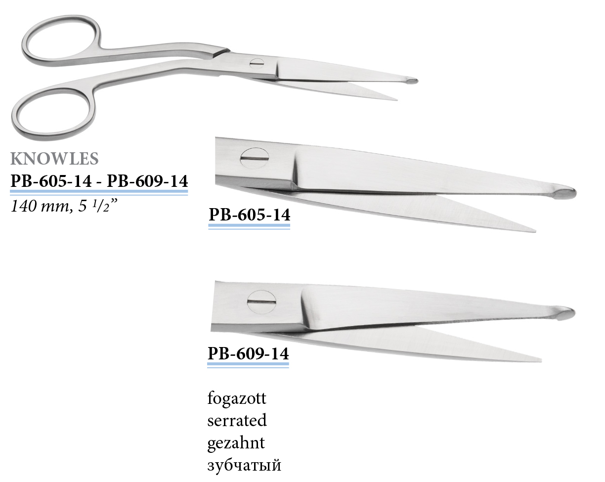 PB-609-14 Knowles kötszerolló, hajlított, fogazott, 140 mm