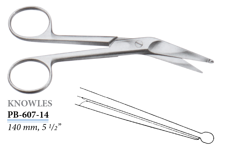 PB-607-14 Knowles kötszerolló, hajlított, 140 mm