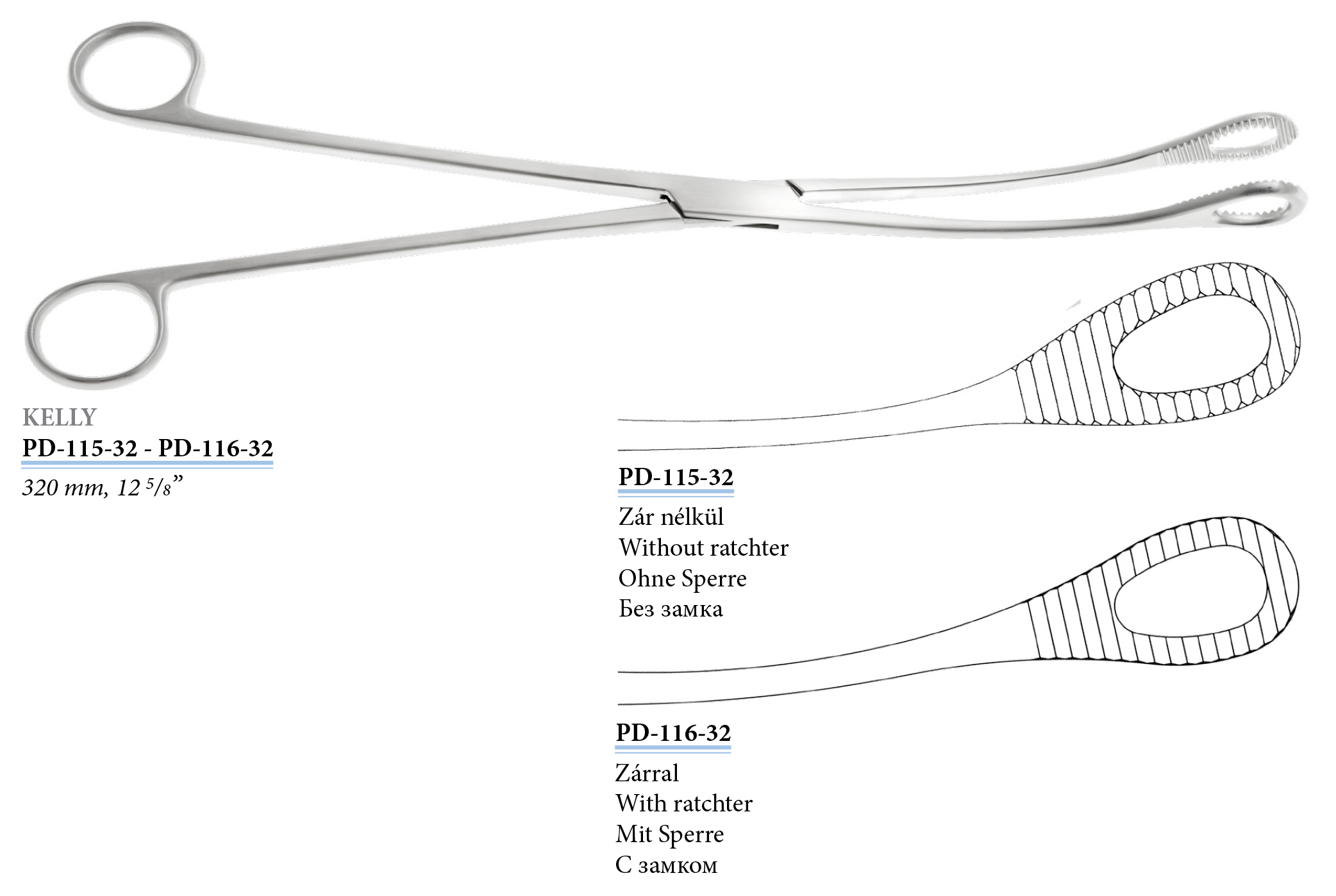 PD-115-32 Kelly tampon- és szövetfogó, hajlított, zárral, 320 mm