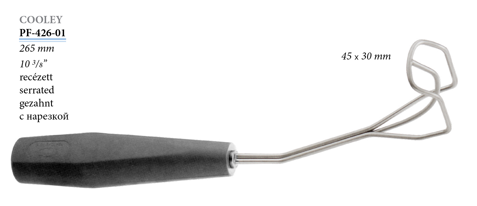 PF-426-01 Cooley sebészeti kampó, fogazott, 45x30 mm, 265 mm