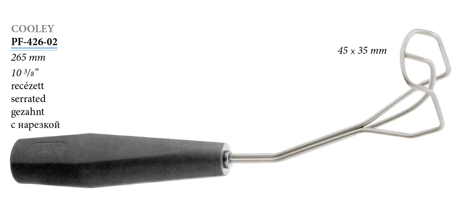 PF-426-02 Cooley sebészeti kampó, fogazott, 45x35 mm, 265 mm
