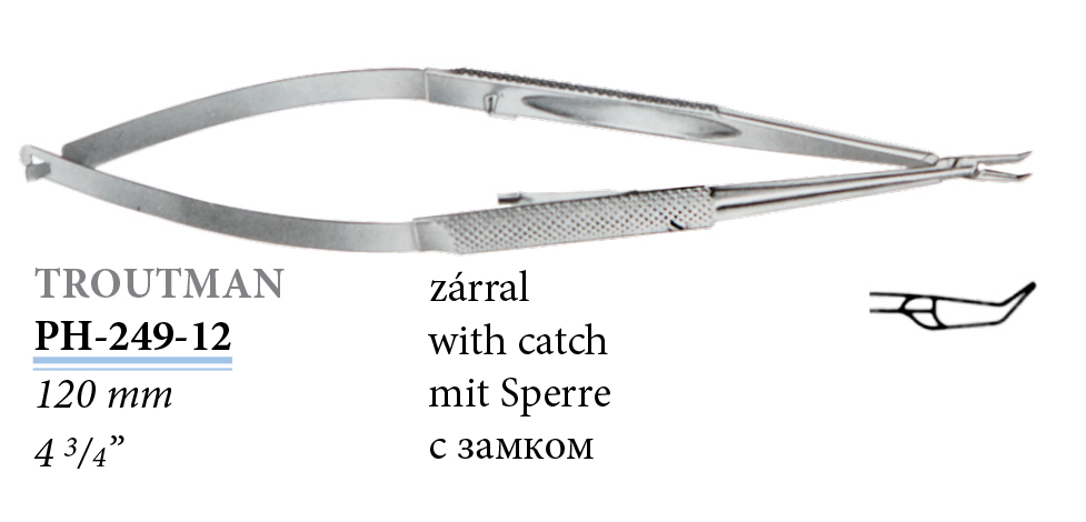 PH-249-12 Troutman mikro tűfogó, zárral, hajlított, 120 mm