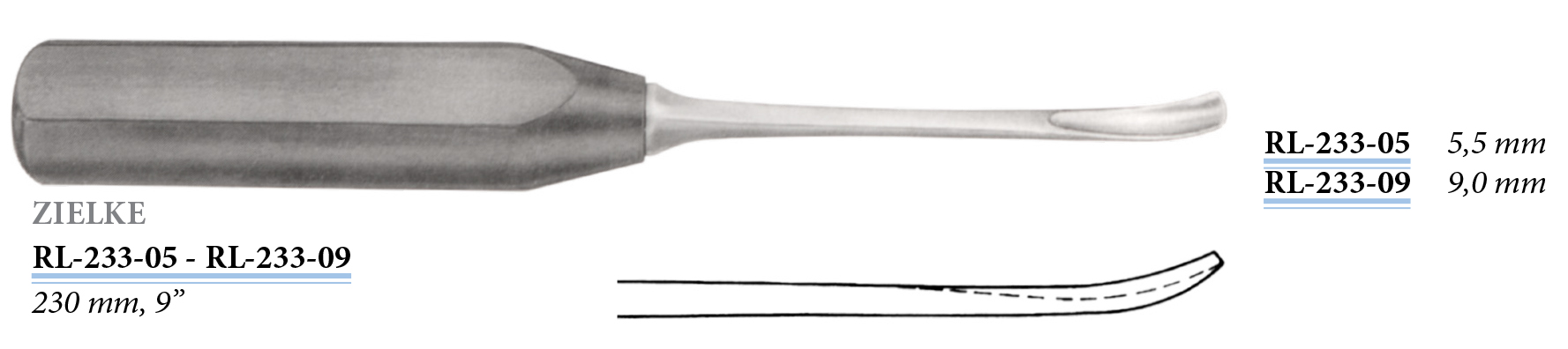 RL-233-09 Zielke csontvéső, hajlított, 9 mm, 230 mm